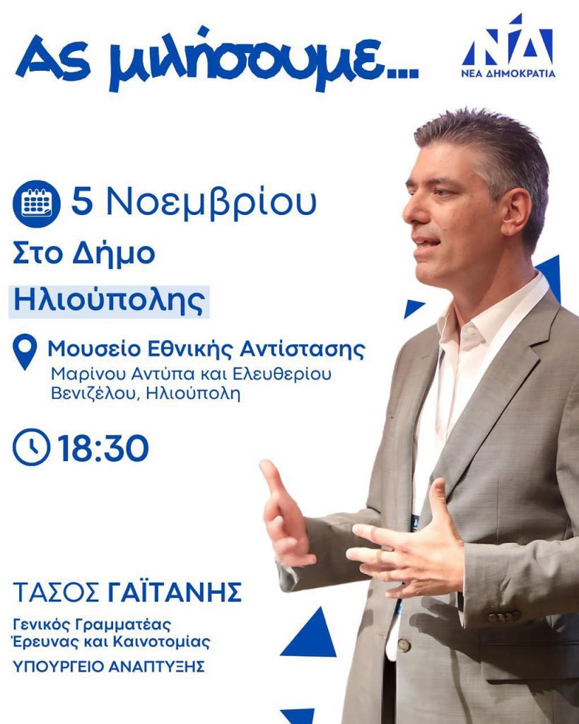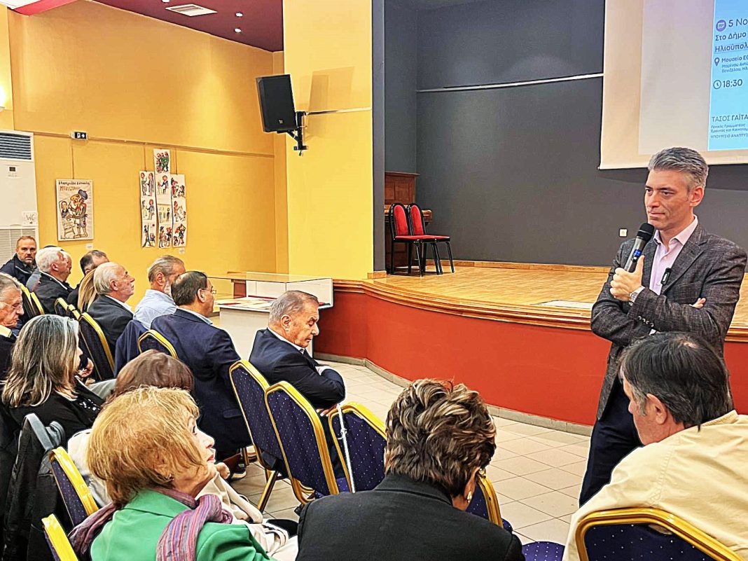 Σε μια πολύ καλά οργανωμένη πολιτική εκδήλωση με κεντρικό σύνθημα “Ας Μιλήσουμε…“, ο κ. Τάσος Γαϊτάνης, Γενικός Γραμματέας Έρευνας και Τεχνολογίας συναντήθηκε με τους φίλους του στην Ηλιούπολη, που γέμισαν την αίθουσα εκδηλώσεων του Μουσείου Εθνικής Αντίστασης του Δήμου Ηλιούπολης.