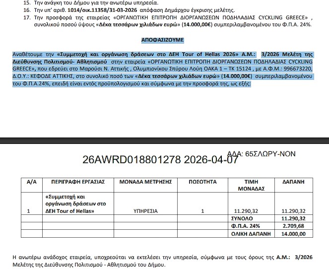 Σύμφωνα με τη Διαύγεια με απόφαση δημάρχου έγινε ανάθεση σε εταιρεία η διοργάνωση ποδηλατικής εκδήλωσης που περιλαμβάνει τη διέλευση ενός ποδηλατικού αγώνα από την κεντρική πλατεία του Δήμου Ηλιουπόλεως, την Κυριακή 10 Μαΐου 2026 και τη διεξαγωγή ενδιάμεσου sprint σε ευθεία διαδρομή, που περιλαμβάνει:
