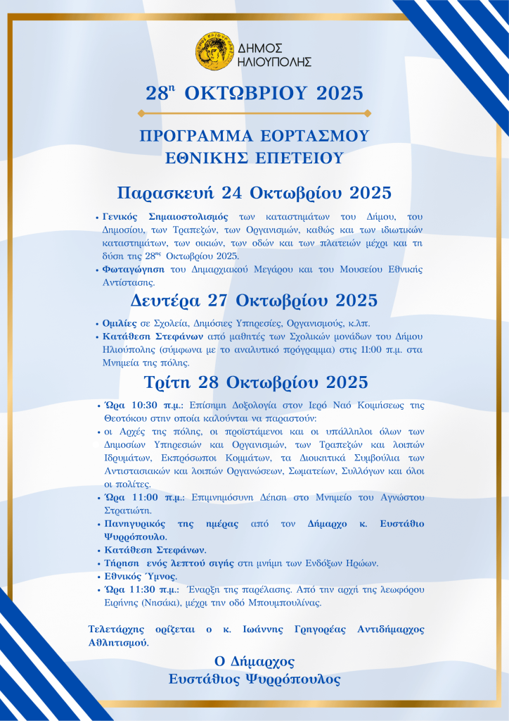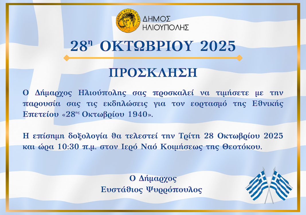 Ο Δήμαρχος Ηλιούπολης σας προσκαλεί να τιμήσετε με την παρουσία σας τις εκδηλώσεις για τον εορτασμό της Εθνικής Επετείου «28η Οκτωβρίου 1940».