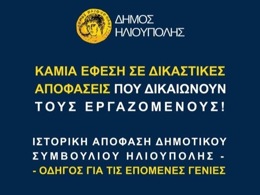 Η λήψη απόφασης την Πέμπτη 27 Νοεμβρίου 2025 περί μη άσκησης από το Δήμο Ηλιούπολης ενδίκων μέσων κατά ευνοϊκών για τους εργαζόμενους δικαστικών αποφάσεων αναδεικνύει την ξεκάθαρη πολιτική μας και την στάση ζωής, για την οποία μας έχει εμπιστευθεί ο κόσμος.