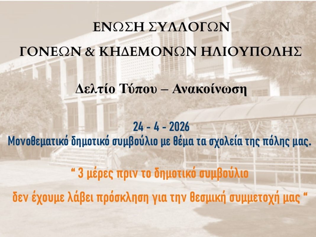 Ενημερώνουμε τους συλλόγους γονέων, τους συλλόγους εκπαιδευτικών, τους πολίτες της Ηλιούπολης και όλους τους φορείς της πόλης, ότι την Παρασκευή 24/4/2026 στις 17:00, έχει προγραμματιστεί μονοθεματικό δημοτικό συμβούλιο με θέμα τα σχολεία της πόλης μας.