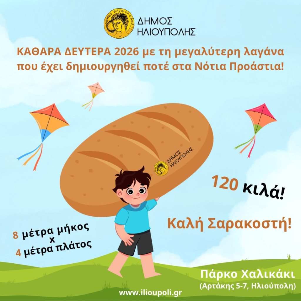 Ο Δήμος Ηλιούπολης τιμά τις ελληνικές παραδόσεις και θα εορτάσει την Καθαρά Δευτέρα στο πάρκο “Χαλικάκι”, με τη μεγαλύτερη λαγάνα που έχει δημιουργηθεί ποτέ στα Νότια Προάστια, που θα ενθουσιάσει μικρούς και μεγάλους!