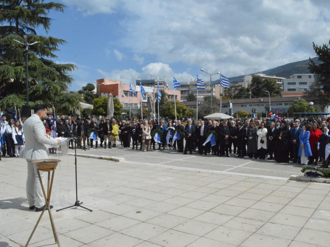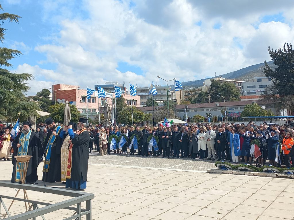 Εν συνεχεία έγινε στο Μνημείο των Ηρώων στην πλατεία Φλέμινγκ η Επιμνημόσυνη Δέηση, εκφωνήθηκε ο Πανηγυρικός της ημέρας από τον Δήμαρχο κ. Ευστάθιο Ψυρρόπουλο, έγινε κατάθεση στεφάνων και η τελετή ολοκληρώθηκε με την τήρηση ενός λεπτού σιγής στη μνήμη των ενδόξων ηρώων και τον Εθνικό Ύμνο.