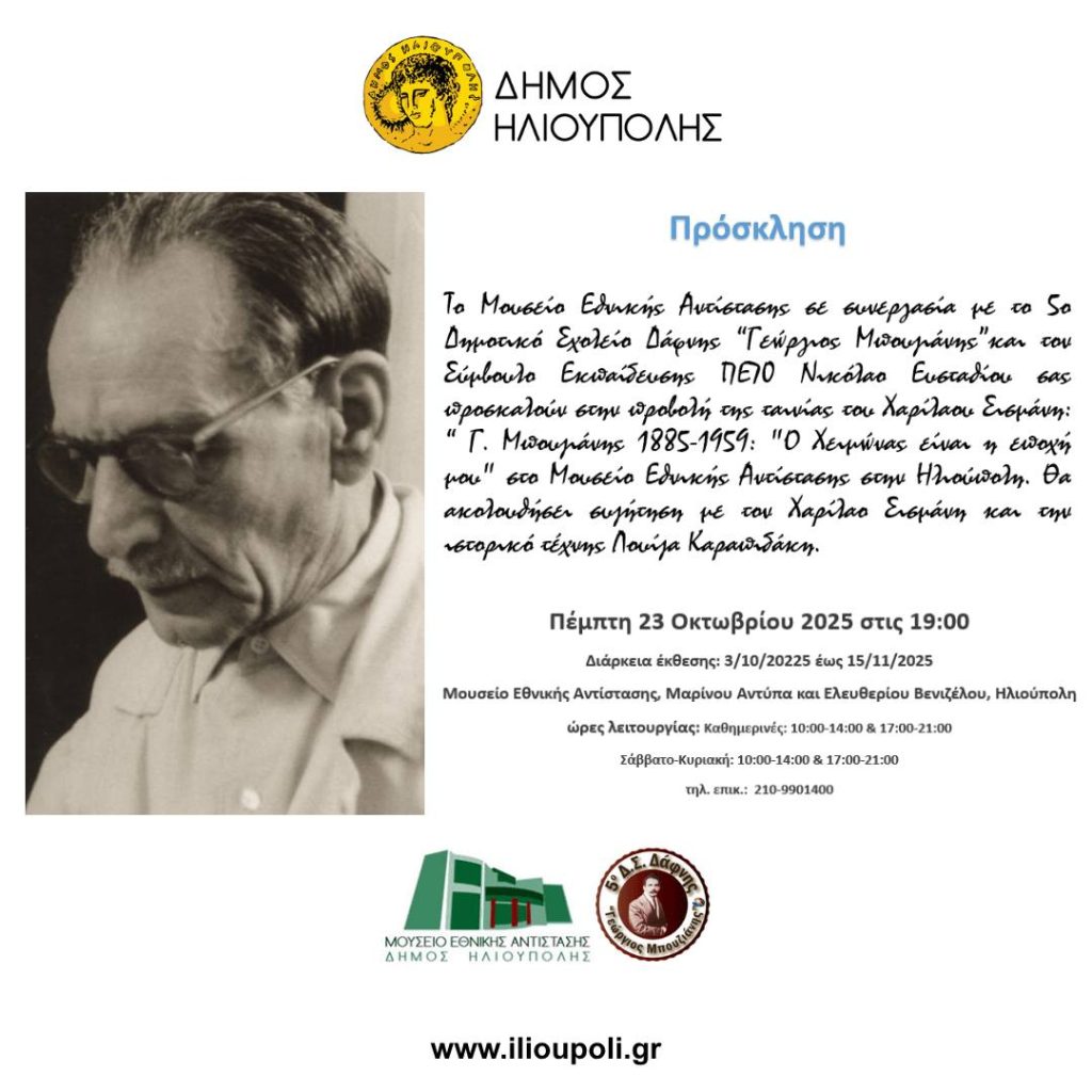 Το Μουσείο Εθνικής Αντίστασης Ηλιούπολης, σε συνεργασία με το 5ο Δημοτικό Σχολείο Δάφνης «Γεώργιος Μπουζιάνης» και τον Σύμβουλο Εκπαίδευσης Νικόλαο Ευσταθίου, στο πλαίσιο της έκθεσης ζωγραφικής εικαστικών καλλιτεχνών «…με αφορμή τον Γιώργο Μπουζιάνη», φιλοξενεί μια ειδική εκδήλωση-προβολή αφιερωμένη στον μεγάλο Έλληνα εξπρεσιονιστή Γιώργο Μπουζιάνη στις 23 Οκτώβρη ημέρα που συμπληρώνονται 66 χρόνια από τον θάνατο του (23 Οκτωβρίου 1959).