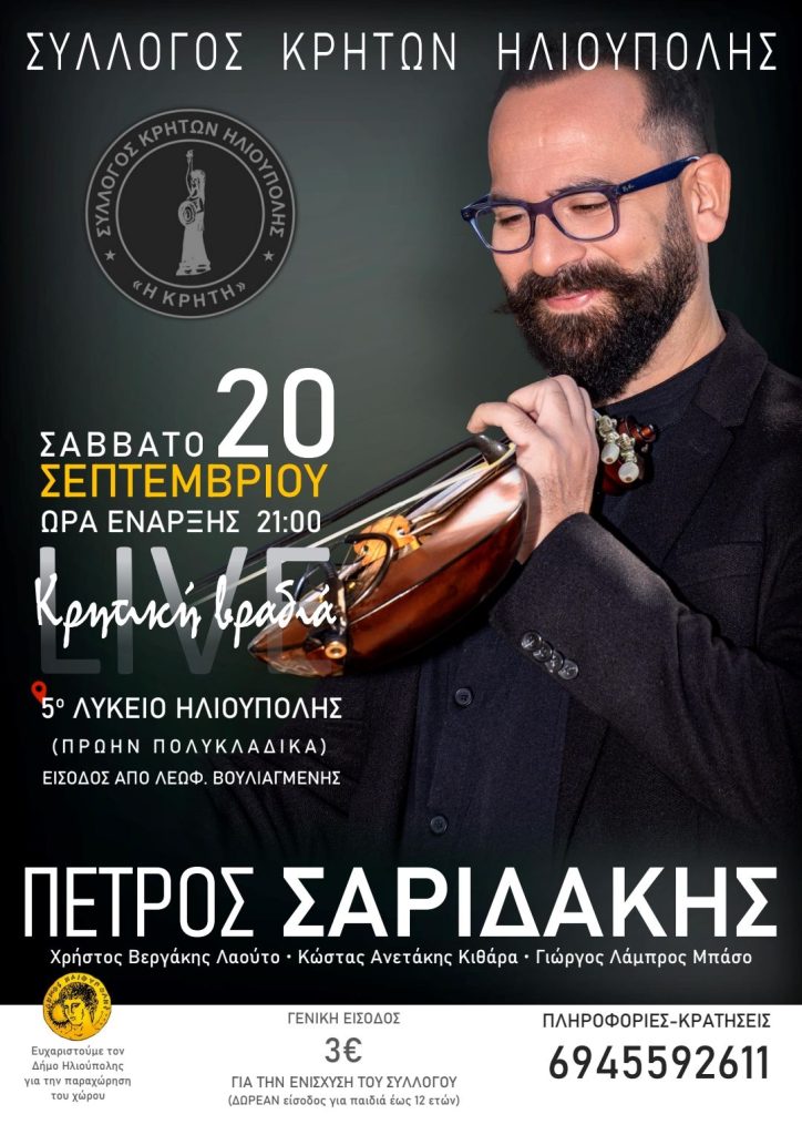 Ο Σύλλογος Κρητών Ηλιούπολης με χαρά σας καλεί στο ετήσιο γλέντι που διοργανώνει στις 20/9/2025 στα Πολυκλαδικά.