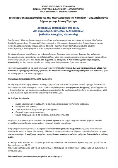 Η Συμμαχία των 5 δημάρχων καλεί όλους τους πολίτες σε συγκέντρωση για την υπογειοποίηση της Κατεχάκη στη συμβολή Ελευθερίου Βενιζέλου & Αναστάσεως στην Ηλιούπολη, στο ρεύμα καθόδου.